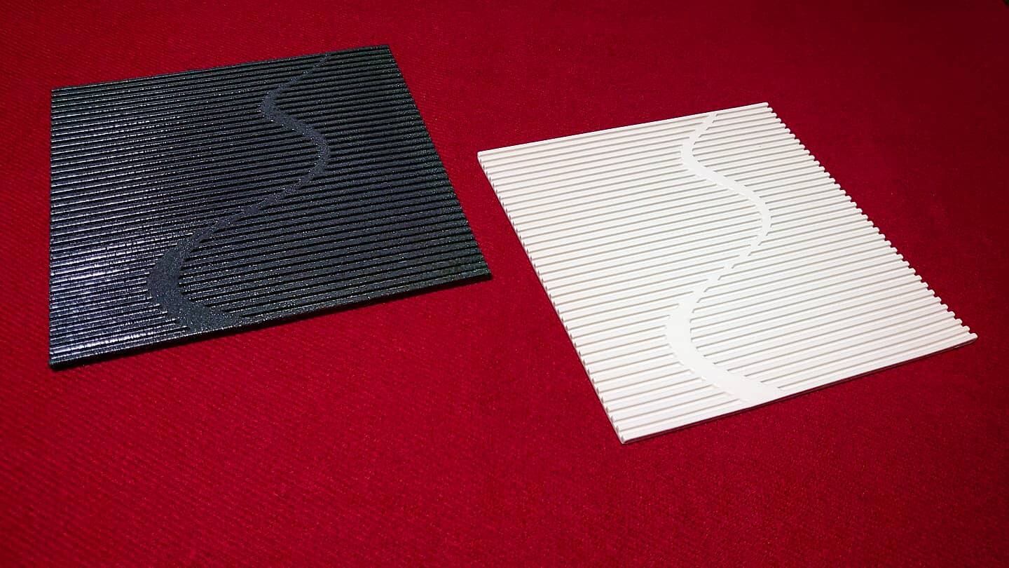 波板「流」は、規則的に続く線の中をひとつの「流」が走る作品。陰影で際立つ模様が美しい波板「流」です。